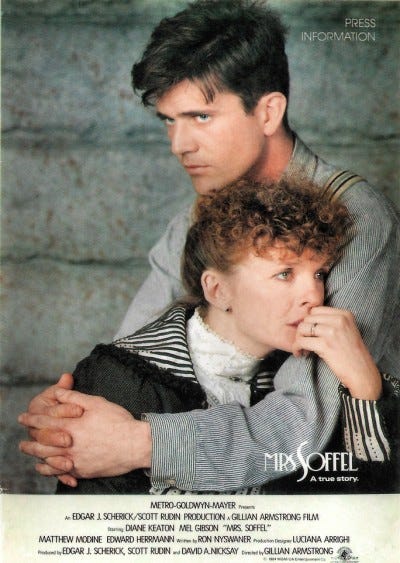 So, the final flight as shown in the movie is a lot longer and more exciting than the real-life one; that’s fine, it gives us more time with the fantastic outdoor imagery. So the real brothers were probably a lot more criminal and a lot more dim than the characters in the movie; that’s fine, too. This is a movie made 82 years after the original events. I’d say that passes the statute of limitations for accuracy. This film isn’t depicting the real Mrs. Soffel (who died of typhoid in 1909, aged 42). It’s depicting Diane Keaton’s and Gillian Armstrong’s impression of what could drive a woman to such a rash act.